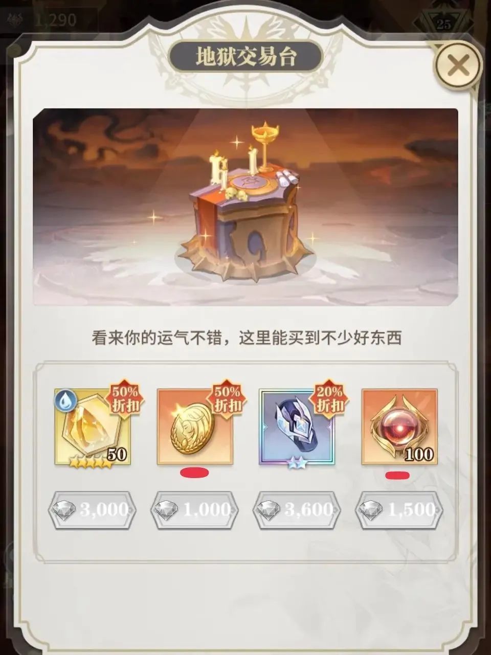 ✦必买:敏堂刷委托,紫色以及紫色以上全接,蓝色只接钻石以及进阶石。地狱路里的地狱交易台购买价格为1000的祈祷币以及价格为1500钻石的上品神灵。