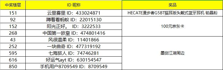 以上的少侠们,记得关注墨剑官方的璇玑@璇玑,私信发送【姓名】、【邮寄联系电话】、【收件地址】(这个很重要!!!),信息收集完毕后,会尽快安排给大家寄送奖品~