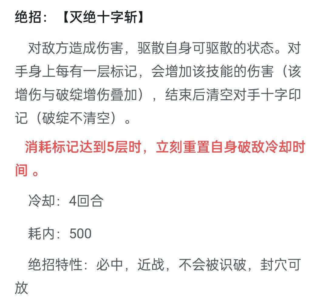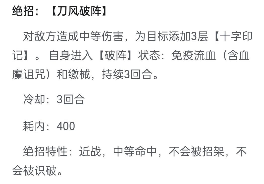 【理想情况下,开局刀风破阵3层印记,对手被破敌4层印记,第二回合普攻5层印记,对手被缴械/封穴。第三回合灭绝十字斩消耗印记同时刷新破敌cd。】