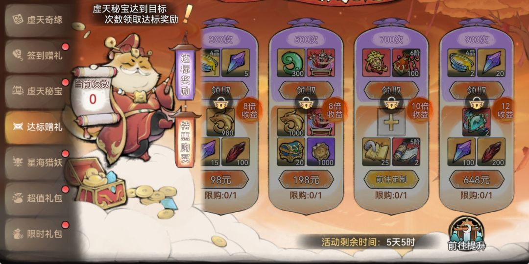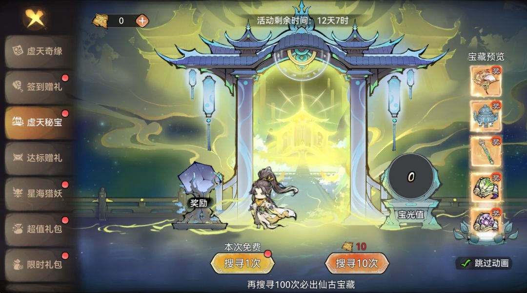 - 秘宝探寻次数达到700次可购买【定制礼包】,自选领取稀世功法“天一剑典全篇”、仙阶纯钧灵露、凝元丹等珍稀道具。