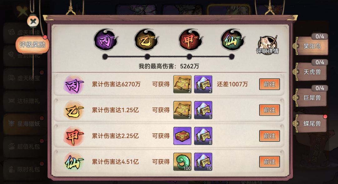 - 活动期间,会逐步开放4只首领的试炼挑战,完成挑战可获得通关奖励和累计伤害达标奖励(共有4个目标等级)。