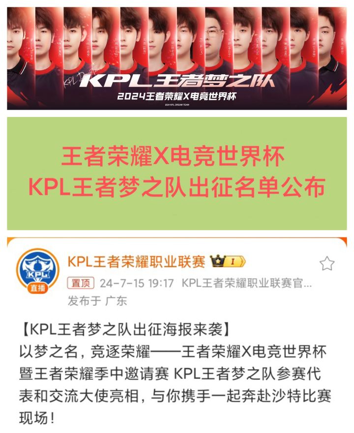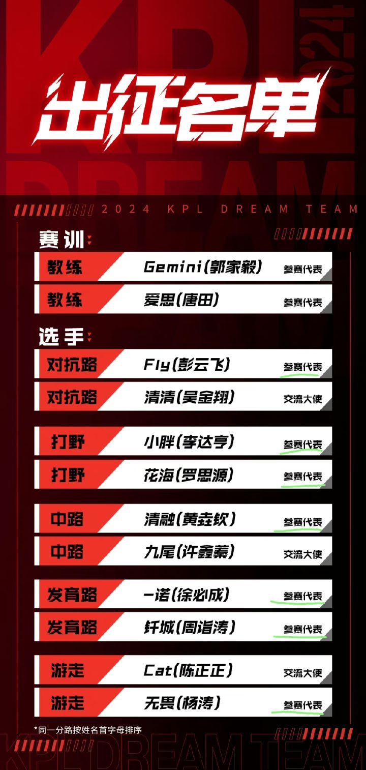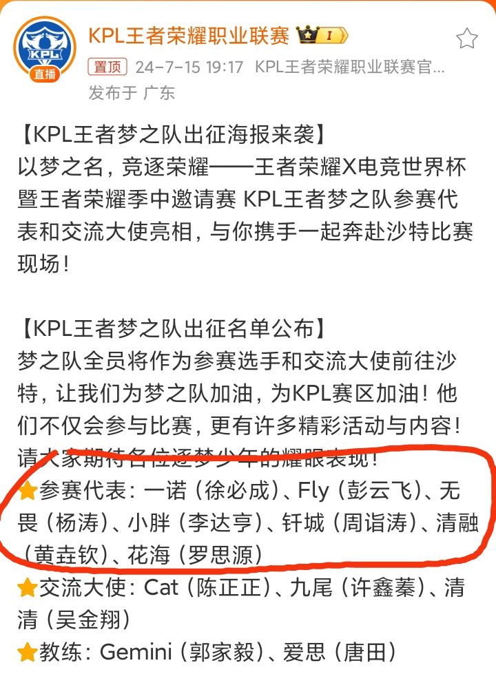 7/15号晚上,《王者荣耀》官博公布了王者荣耀X电竞世界杯,KPL王者梦之队参赛代表和交流大使名单❗❗❗ 参赛代表:一诺(徐必成)、Fly(彭云飞)、无畏(杨涛)、小胖(李达亨)、钎城(周诣涛)、清融(黄垚钦)、花海(罗思源)