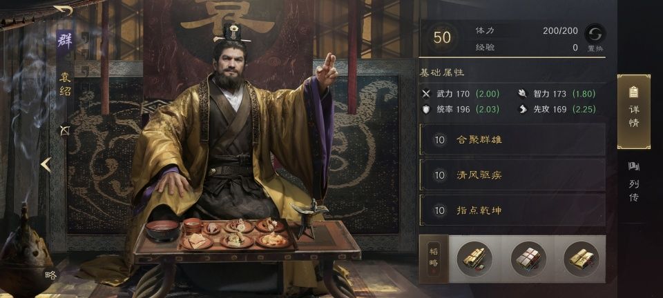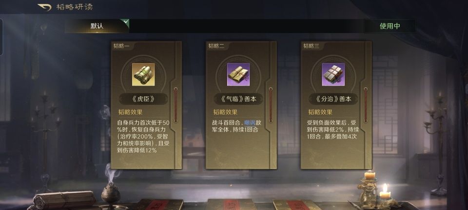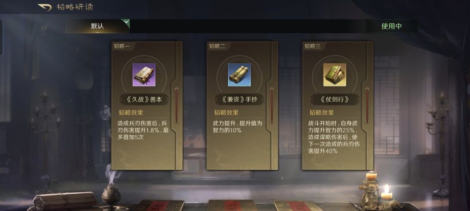 袁绍躲在后排得到了防护加持,在战法的配置上是明显的奉献型。合聚群雄和指点乾坤战法,都是为了给徐庶加强攻势。而清风驱疾,则更多是考虑到前排的程普,他非常需要治疗和驱散。韬略库里的三本书,依次研读了世家、合谋和文武。程普属吴,徐庶属蜀,满足生效50%群雄加成的条件。说到底,这也还是为了徐庶。