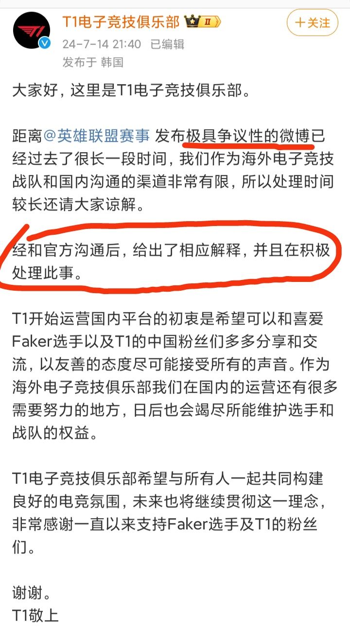 7/14号晚,Faker所在的T1俱乐部发文称: