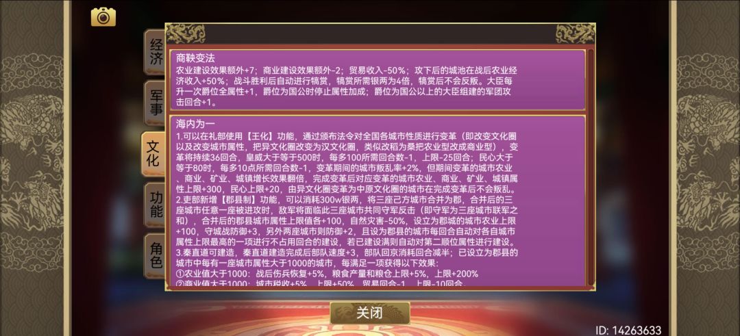 3.海内为一(改农业城市)、商鞅变法(农业建设+7)、三兆问黎(建设方针+200%)、削藩之策(建设方针+50%)