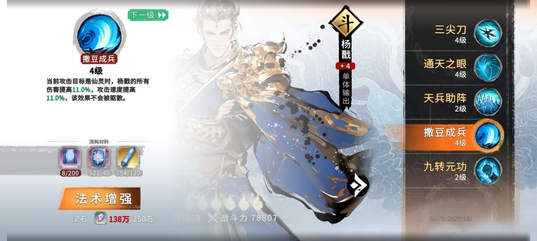 杨戬最大的痛点就是几乎没用的5技能和极其脆皮的身板,我即使给杨戬领先其他单位十级的等级和人参果的buff加持以及嫦娥,龙女,巨灵,鲶鱼怪的buff加成,仍然是经常活不过一分钟甚至三四十秒暴毙,其他斗系都变异了,猴子甚至拥有高贵的无法选中,我二郎险胜真菌甚至不配有条狗(哮天犬:?)