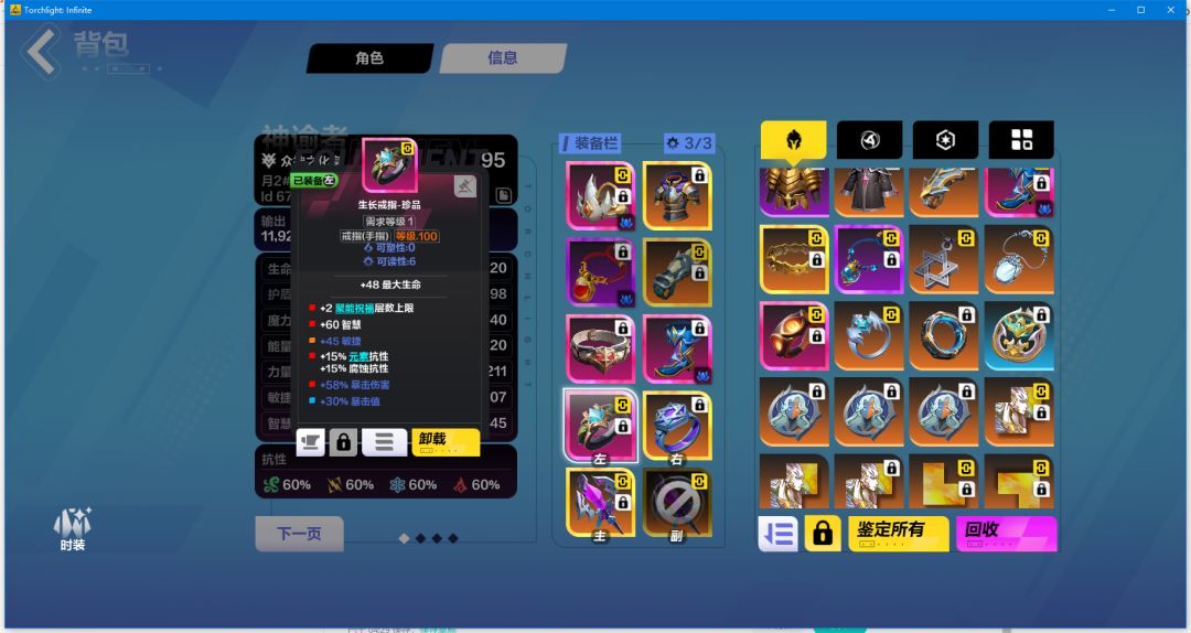 一般的戒指就这样:聚能+智力+抗性,后面爆伤诅咒效果随意,缺暴击补一点暴击值,敏捷不用打,最好是打护盾或者点伤