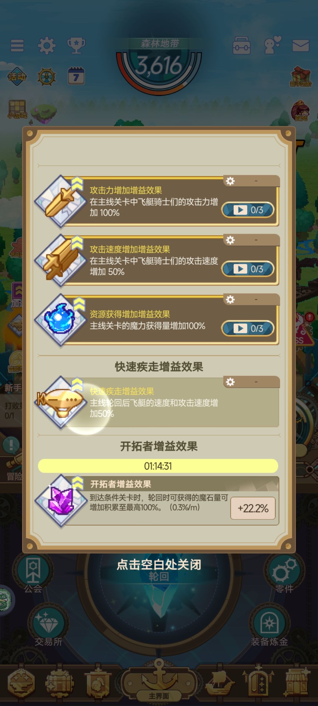 4、一些buff的机制是什么没有说明,如图,快速疾走增益效果是轮回后产生的,它是否有时间限制,数值会不会变化?开拓者增益效果,似乎是到达一定的关卡增加一定的收益,但是它有时间限制,时间过了就没有收益了,推关能增加时间,这里缺少一个具体的说明和提示,建议在buff时间快到之前提示玩家进行轮回以获得最大收益。