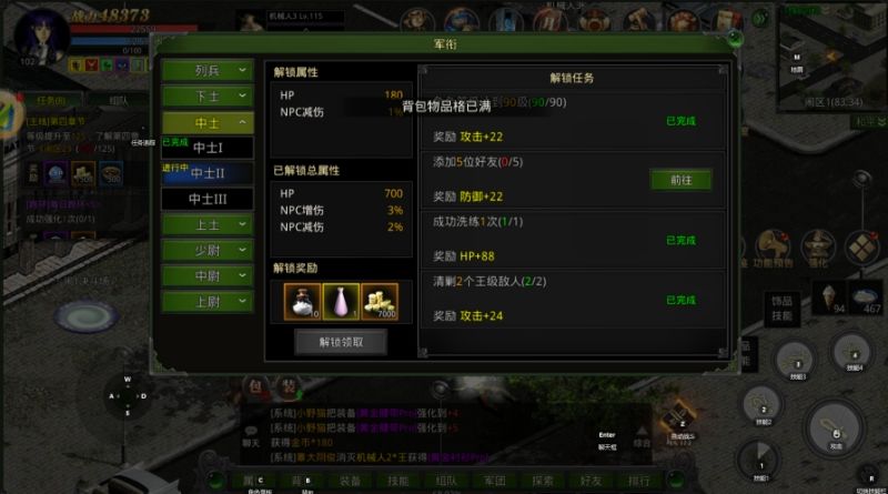 然后就是军衔任务,有很多军衔任务需要穿戴高强化装备来完成,而自己没有高强化的需求,这时候就可以使用前面说到的使用1级的白板装备来强化,成本很低,碎了也不心疼。比如我的+8的运动帽也就花了几十万金币就上去了,这还是我脸非常黑才花费这么多的。