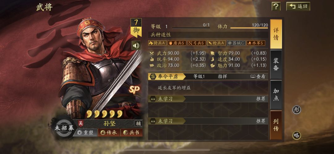 1、九变-无功而励:每回合行动时,若自身处于缴械、计穷、震慑或混乱状态,则恢复一定兵力(恢复率80%);