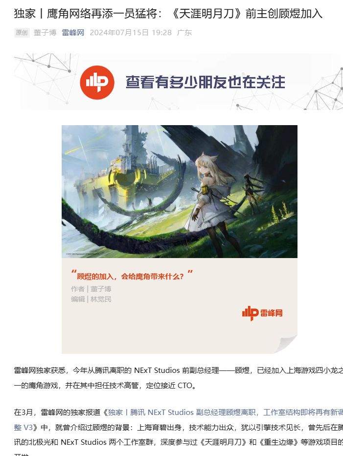 【新闻】天涯明月刀前主创顾煜加入鹰角网络
