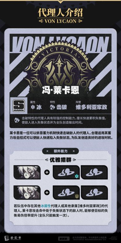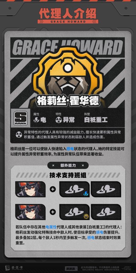 这其中比利可不用花全力来培养,做到够用就好,因为我们肯定需要一个限定S级角色来担任主C的。至于安比和妮可,如果你是零氪、微氪玩家,那么建议可以花资源培养,因为这两角色的表现还不错。如果你有余力盯着角色池中的强力角色,那么这俩培养到够用就行,毕竟只是开局角色。接下来就是至关重要的新手池首金,我们可以根据首金角色来决定配队和抽卡思路。另外提一句,绝区零三测的新手池和常驻池合并了,大家公测时直接抽常驻池就好了,前50抽必出S级角色。首先绝区零常驻池S级角色为:莱卡恩(冰击破)、猫又(物理强攻)、11号(火强攻)、丽娜(电支援)、格莉丝(电异常)、珂蕾妲(火击破)。