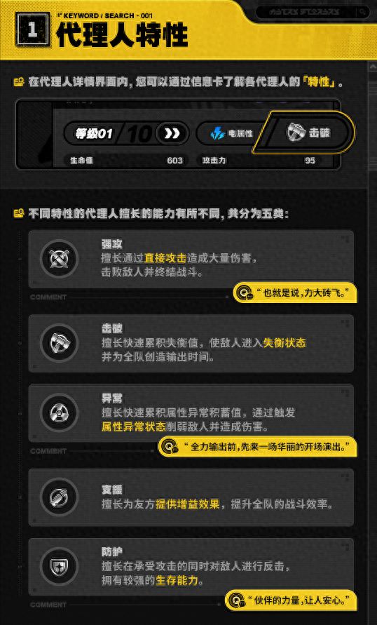 在绝区零前期,我们该怎么编制我们的队伍呢?首先,我们要搞清楚绝区零的角色分类,目前所有角色按照特性分为强攻、击破、异常、支援、防护,同时还按属性分为火、电、冰、物理、以太,前期我们主要看角色特性来编制队伍。