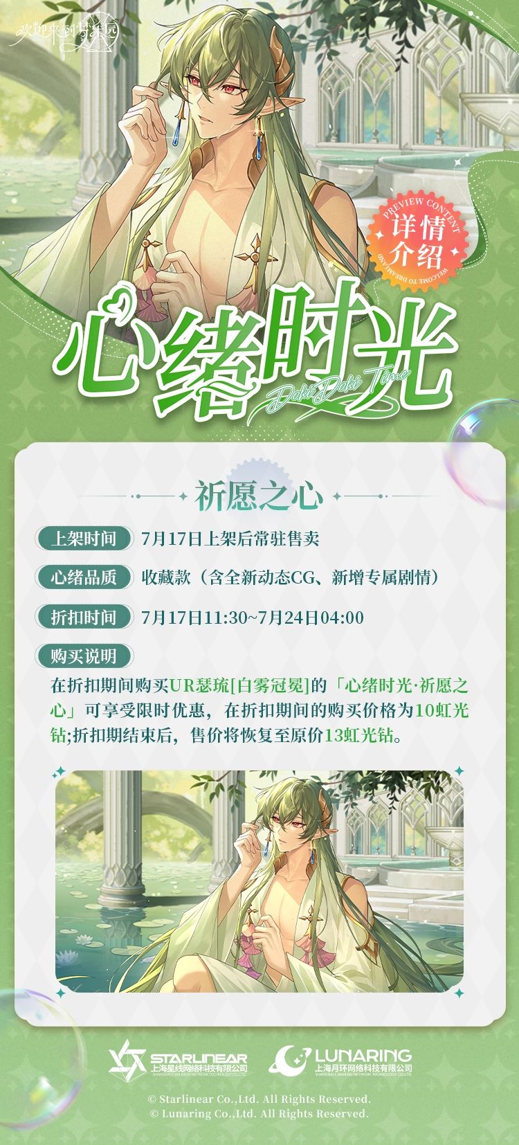 - 售价:在折扣期间购买「心绪时光·祈愿之心」可享受限时优惠,在折扣期间的购买价格为10虹光钻,折扣期结束后,售价将恢复至原价13虹光钻。