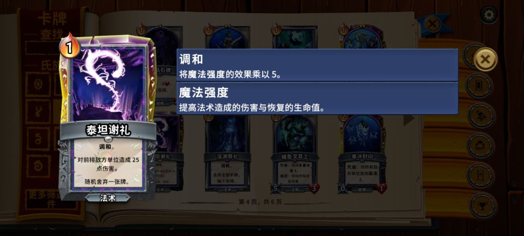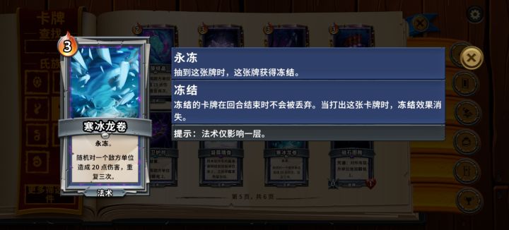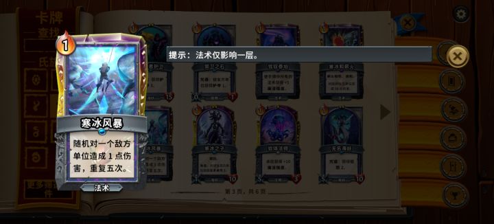 冥卫法术牌库中没有调和的伤害法术牌基本只有寒冰风暴是见到必拿的,一费五次伤害总的升级数值和调和相同且具备清理后排的能力,而同样是多次伤害的螺旋结晶和寒冰风暴则费用高升级收益小,抓牌需要慎重考虑费用问题。