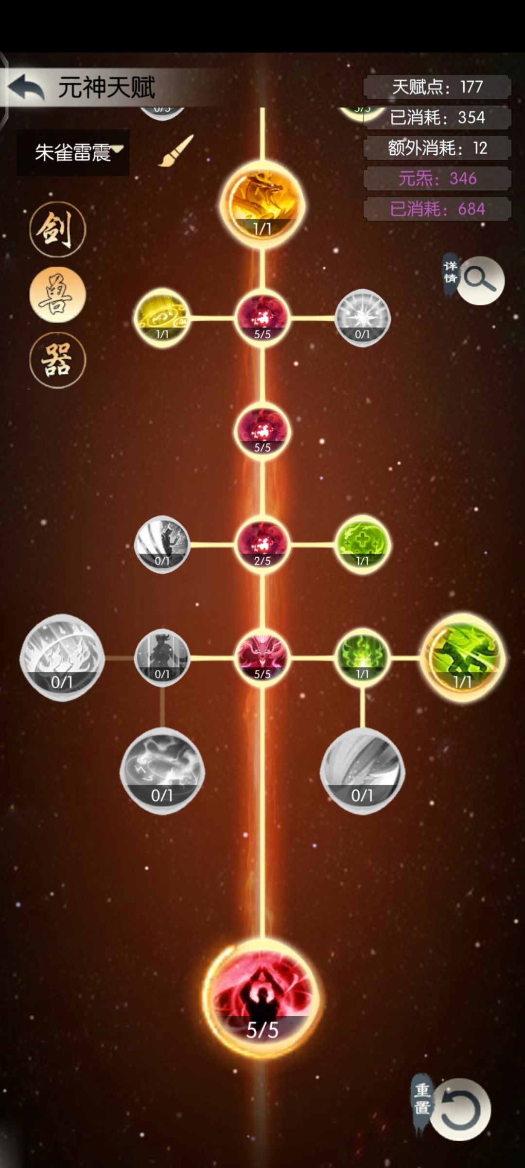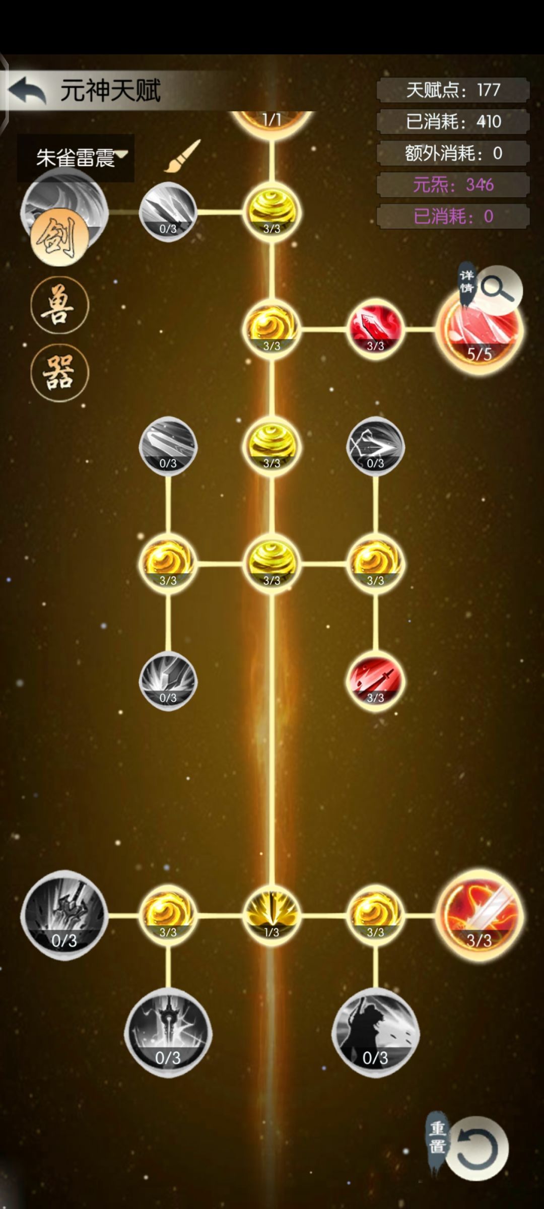 4:天赋,剑天赋选右边,一剑灭生,必须要清除五行斗转决,因为反伤约46亿,不利于配置后续的运行,兽天赋选后发制人如图: