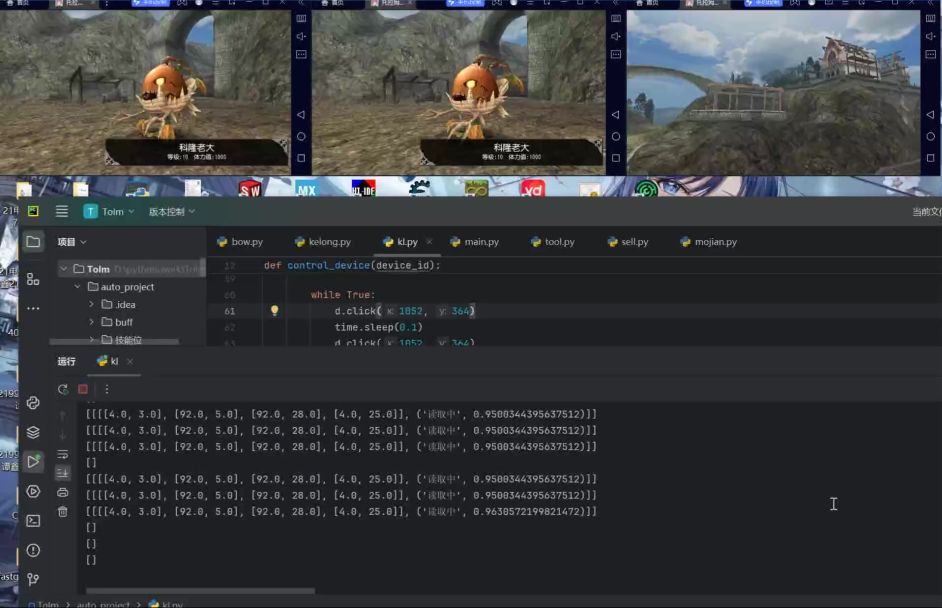 最近看到科隆老大有很多人,不知道大家使用的是连点器还是按键精灵这样的,如果用python的话只需要用到前面讲的ocr文字识别就可以写出很健壮的程序啦,不过仅仅如此也没有再开一贴的必要,这里主要补充一个多开多线程控制的思路。