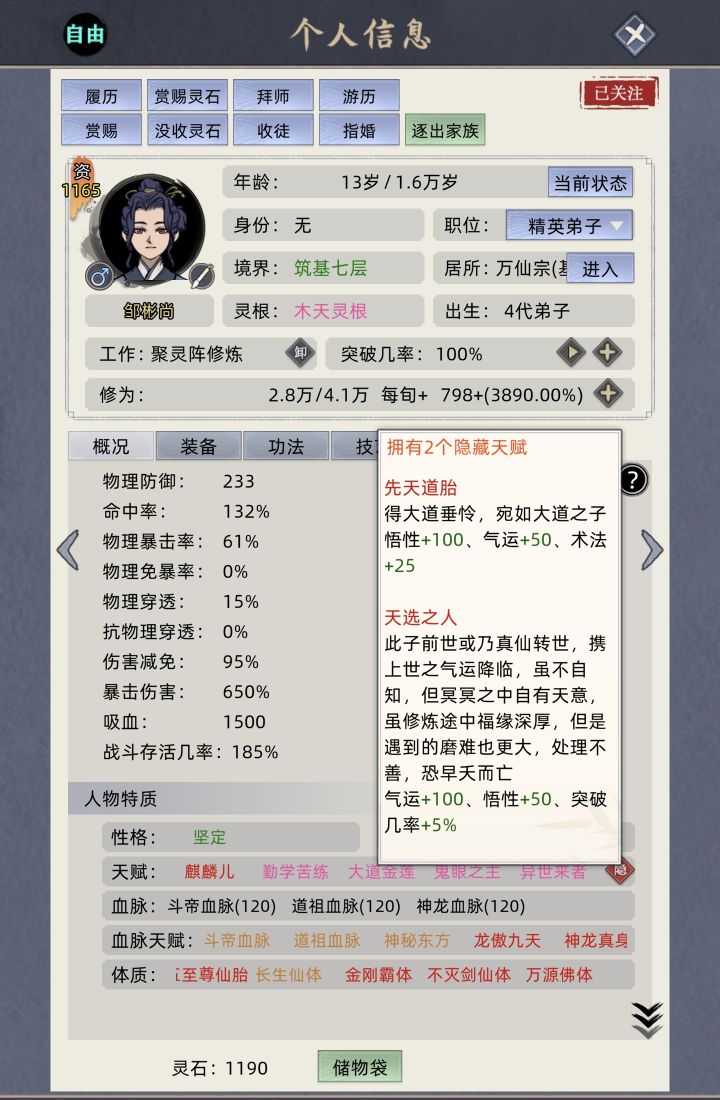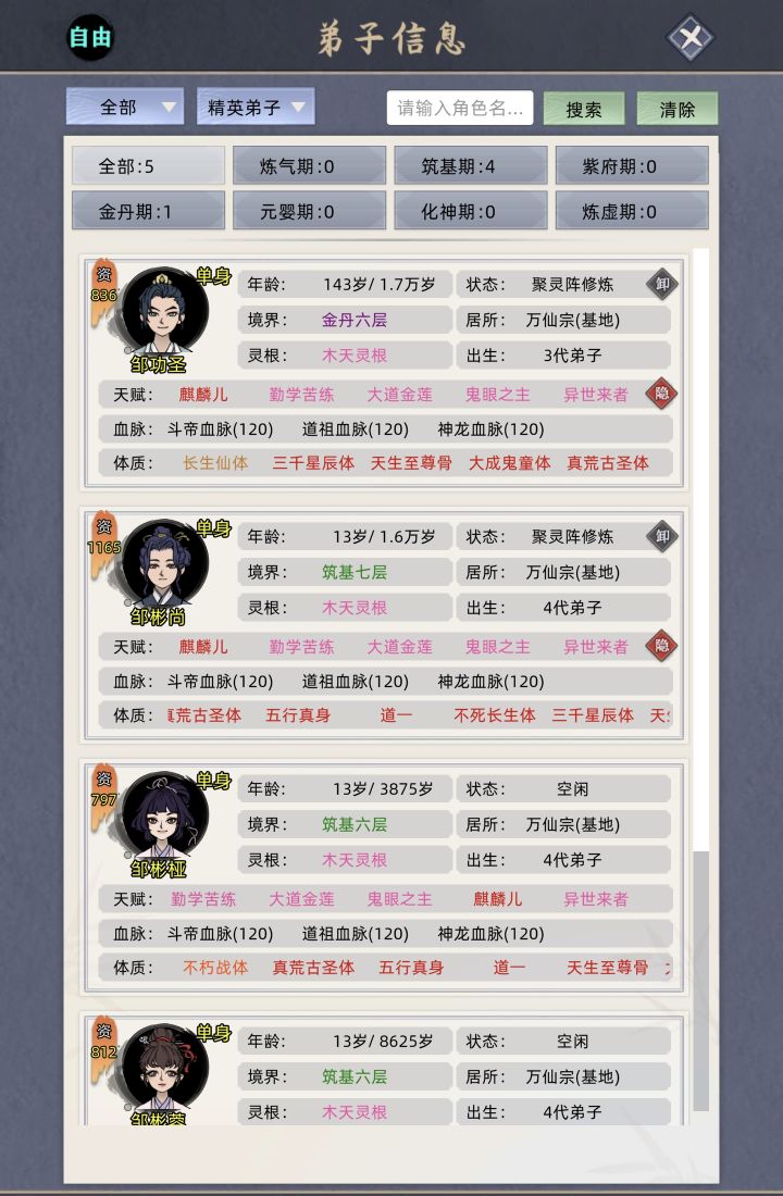1.自然出生弟子 面貌、天赋、体质最多15个