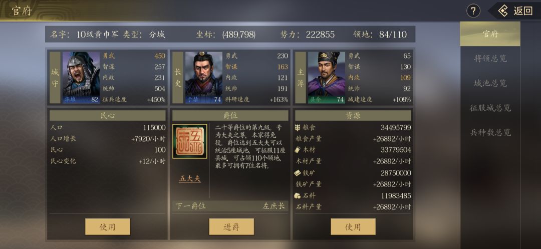 现在特殊兵种还未上线,只有基础兵种和高级兵种,兵营中上面一排是基础兵种,每次招募需要10秒,与招募数量无关。下面一排就是高级兵种,招募时间与兵种和数量有关,招募起来时间比较长,我们需要在官服中任命城守来加速招募,城守武将勇武属性越高加速效果越好,使用勇武符有效。