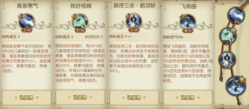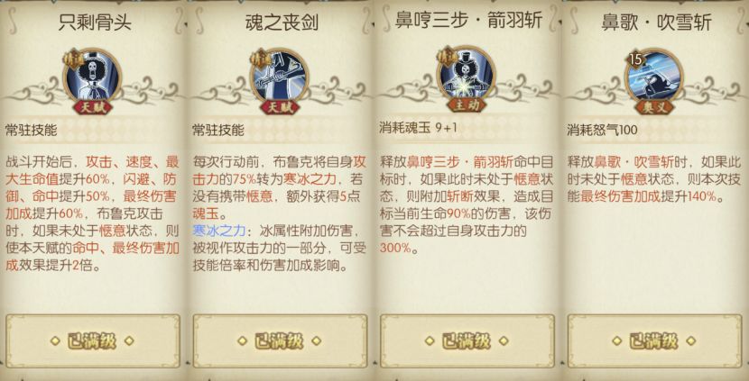 当和之国布鲁克处于非惬意状态时,和之国布鲁克的输出能力将获得极大提升,除了奥义【飞燕曲】提升攻击和速度之外,天赋【只剩骨头】还会提供大量命中和最终伤害加成,天赋【魂之丧剑】提供额外魂玉,主动技能【鼻哼三步·吹雪斩】附带斩断效果,奥义【鼻歌·吹雪斩】则会附加大量最终伤害加成。