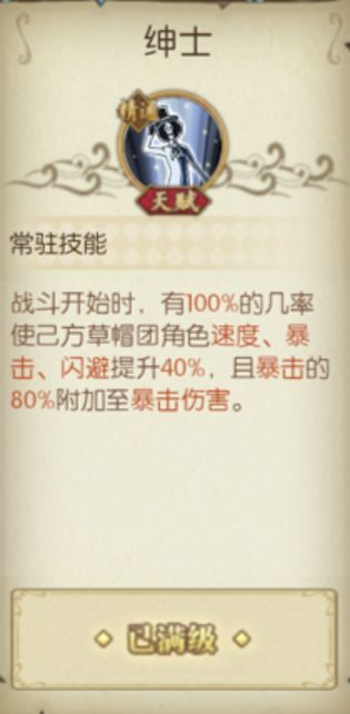 天赋【绅士】使和之国布鲁克为草帽团增速40%,与和之国罗宾并列第一,是草帽团非常优秀的增速角色。