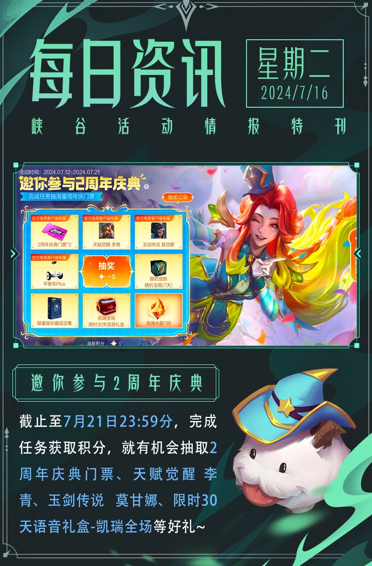 奖励:2周年庆典门票,天赋觉醒 李青,玉剑传说 莫甘娜,限时30天语音礼盒-凯瑞全场,限时皮肤随机宝箱(7天),限量版珍藏设定集,平衡车Plus,龙魂水晶