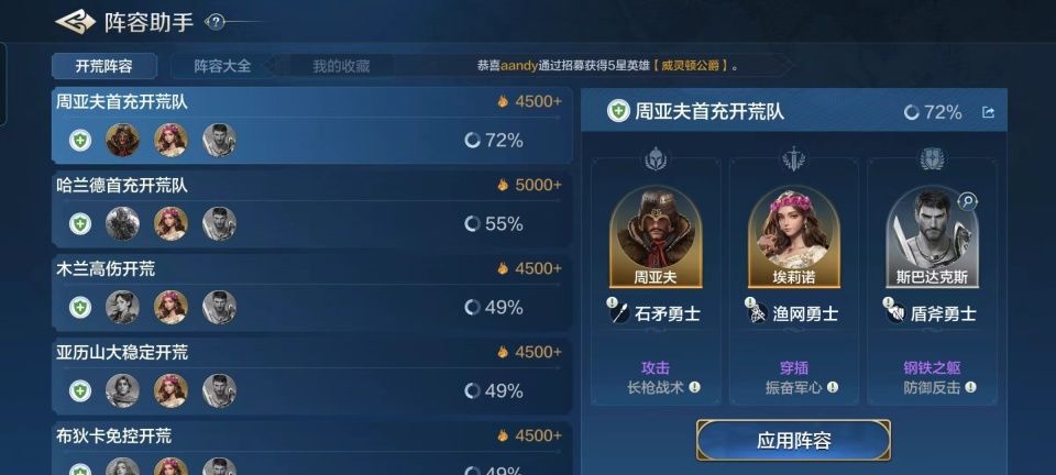 为了进一步让玩家们认识到斯巴达克斯的重要性,阵容助手里面可算是给足了斯巴达克斯宣传版面。新手开荒阶段的周亚夫、哈兰德、花木兰、亚历山大、布狄卡组合都在前锋位置上焊死了斯巴达克斯。