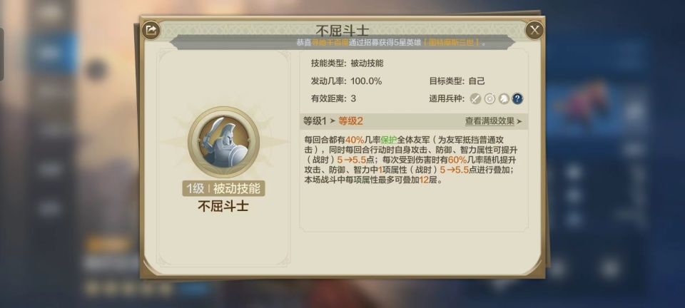 仔细探查一番斯巴达克斯,确实看得出世界启元项目组对他的偏爱。作为肉盾型英雄,他的初始攻击力也不赖,比同类型的很多英雄都高,攻击距离也达到了3,当成进攻型的战士来用也是可以的。专属特技方面,世界启元为他量身打造了不屈斗士。这是个被动技能,意味着发动率达到了100%,每个回合有高达40%的概率为全体队友抵挡普通伤害,他自己还能一边战斗一边叠加基础属性,一口气可以最多叠12层增益,妥妥的越战越勇。