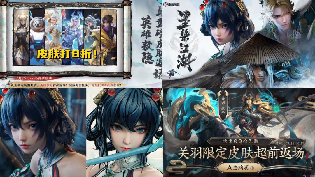 这三款皮肤会在19号上线,不过并不是一次性上线三款,而是陆续上线,喜欢这些皮肤的玩家记得提前备好预算哦。2、关羽武圣返场除了新皮肤之外,这次更新还会有多款限定皮肤迎来返场,首先是关羽的武圣,这款皮肤目前已经返场了,在qq鹅毛市集,玩家可以提前购买这款皮肤,在18号,这款皮肤就会正式上线鹅毛市集,售价1788点券。