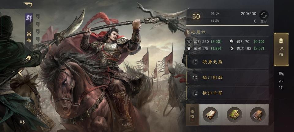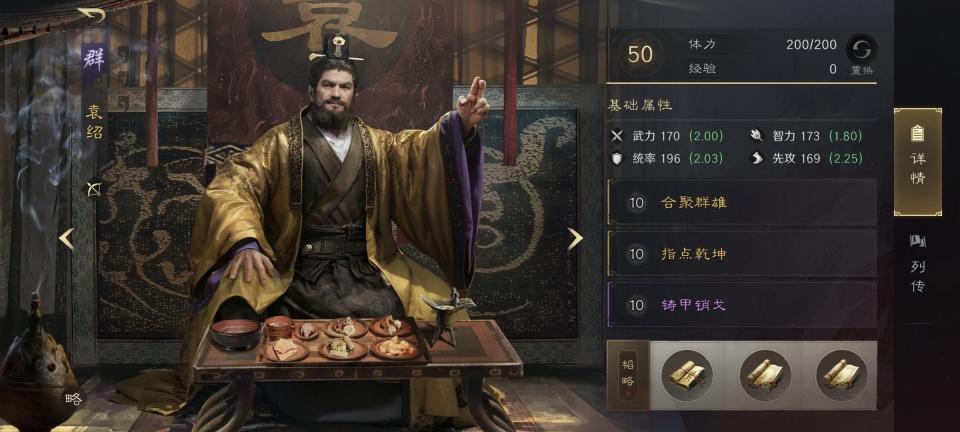 女士优先原则,还是先让处于箕形阵前排的貂蝉出来亮相。可叹袁绍和吕布这俩诸侯级的大老爷们,竟然靠着一个妹子保护周全,实在有损英雄气概。貂蝉的第二和第三战法,分别学习了无难之志和屈人之兵,不得不说,这实在是太有奉献精神了。韬略库里的金书研读了祸水,紫书则是劫智和练士的善本。肉眼可见,吕布的连击输出将大为受益!