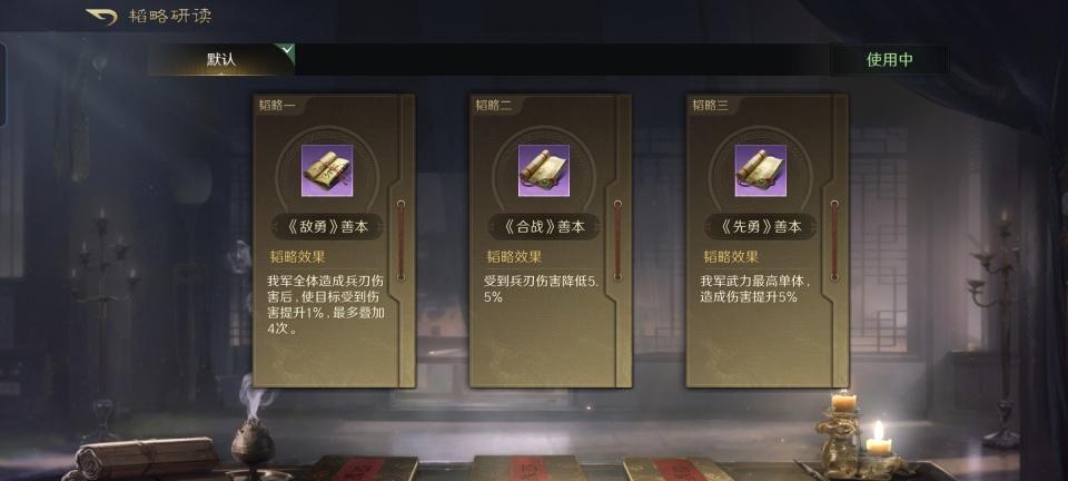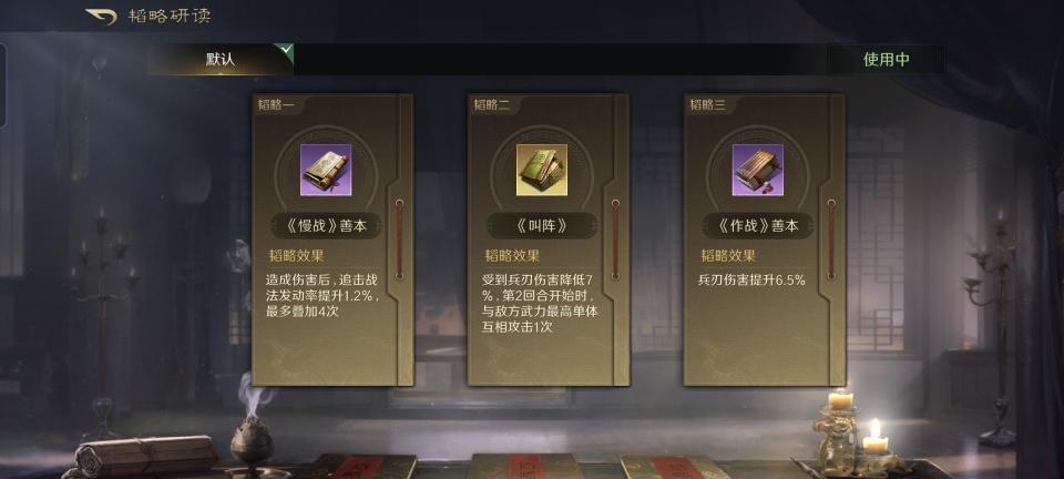 这一场的袁绍实在是太会玩了,合聚群雄能让全队武力值和先攻值最高的吕布频繁找对面的铜雀弓拼刺刀,第二战法指点乾坤也主要是为了让吕布多几次打人的机会。第三战法铸甲销戈没啥好说的,即便是无脑堆叠,让全队在前三回合多抵御几次也是好的。袁绍的韬略库里没有研读金书世家,估计也是考虑到吕布和貂蝉也是群雄阵营,这样没有价值。故而搭配了三本紫书,依次是敌勇、合战和先勇,继续为吕布铺路。