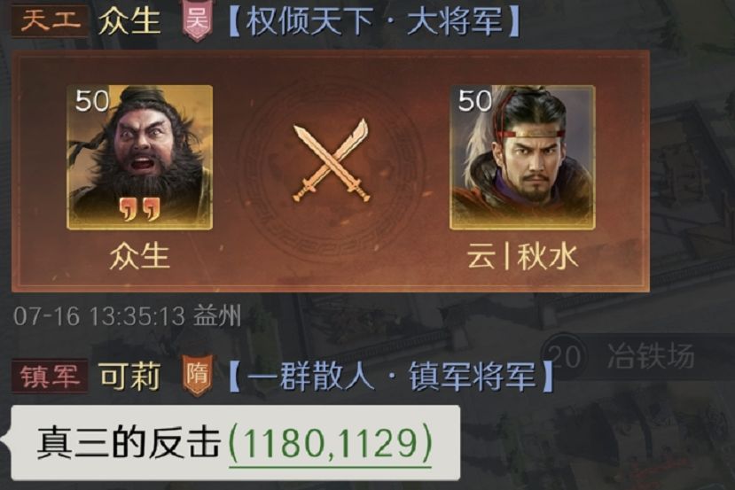 在这里,我要由衷的感谢一篇失败战报的分享者,他的游戏ID名为“众生”。他在世界公频里分享了自己的败报,兵力30000的忠义弓组合竟然惨遭兵力仅15000的三孙队反杀。更令人吃惊的是,在兵力如此悬殊的情况下,三孙在第四回合就锁定了胜局,对方到底是如何在逆境中排兵布阵的呢?