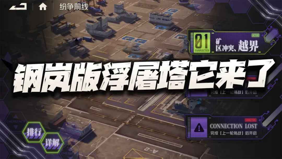 大家好,我是正在通关的何二维一。这两天官方也是开始预告下周四会更新的玩法,“纷争前线”的相关信息了,这个玩法从界面的UI设计来看就跟EVA初号机的紫色+绿色基调一致,也基本上符合于EVA联动版本的设定,不过大家可以不要看这个玩法的外表还是挺新颖的,其实其基础规则倒是和隔壁天地劫的“浮屠塔”玩法有点类似,这里我们就简单来说说其中的逻辑。
