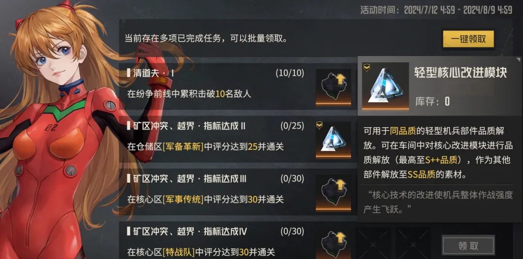 然后值得关注的是,官方之前承诺的这个“XX核心改进模块”在此次活动中终于也是可以获取了,维一数了数大概在第一关中可以2个轻型核心改进模块和1个重型核心改进模块,从这个资源的释放数量上来讲目前感觉还行,就是不知道日后官方在各个活动中是否也会沿用这种数量级的释放幅度,如果照旧的话可能我们想要把联动机兵给升彩的效率也会比维一之前的预期稍微快一些,当然其余的一些核心奖励主要就是cos版初号机的改进模块了。