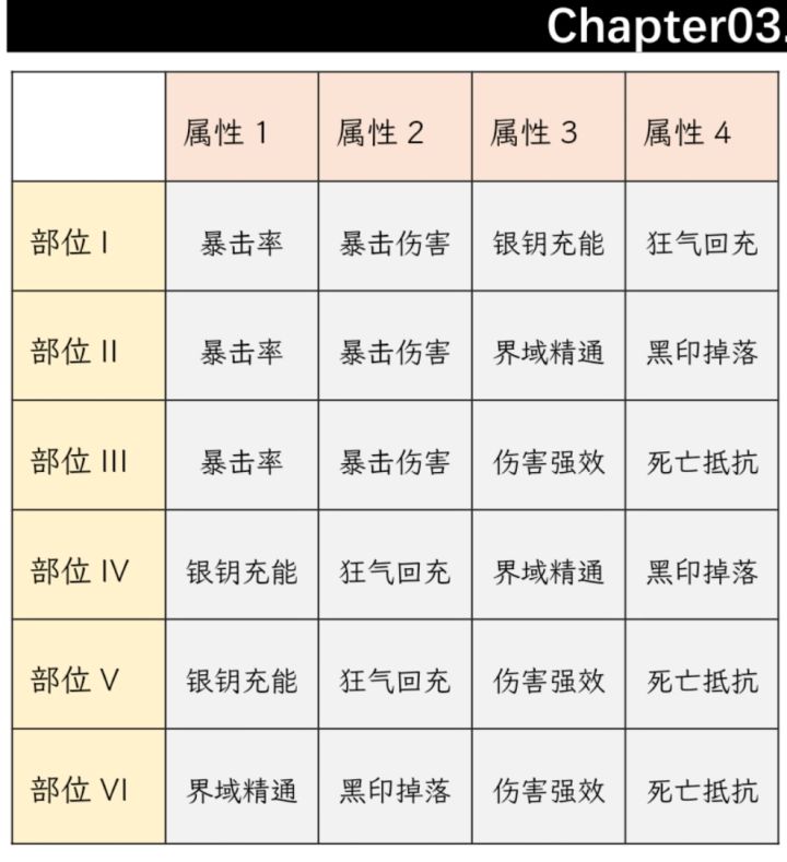 密契的词条分为主词条和副词条,主词条不同位置的属性为固定属性,不会出现变动。具体各个部位的属性可以看封面的图片。