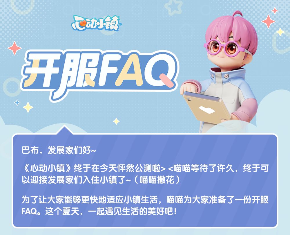 《心动小镇》终于在今天怦然公测啦> <喵喵等待了许久,终于可以迎接发展家们入住小镇了(喵喵撒花)为了让大家能够更快地适应小镇生活,喵喵为大家准备了一份开服FAQ。这个夏天,一起遇见生活的美好吧!