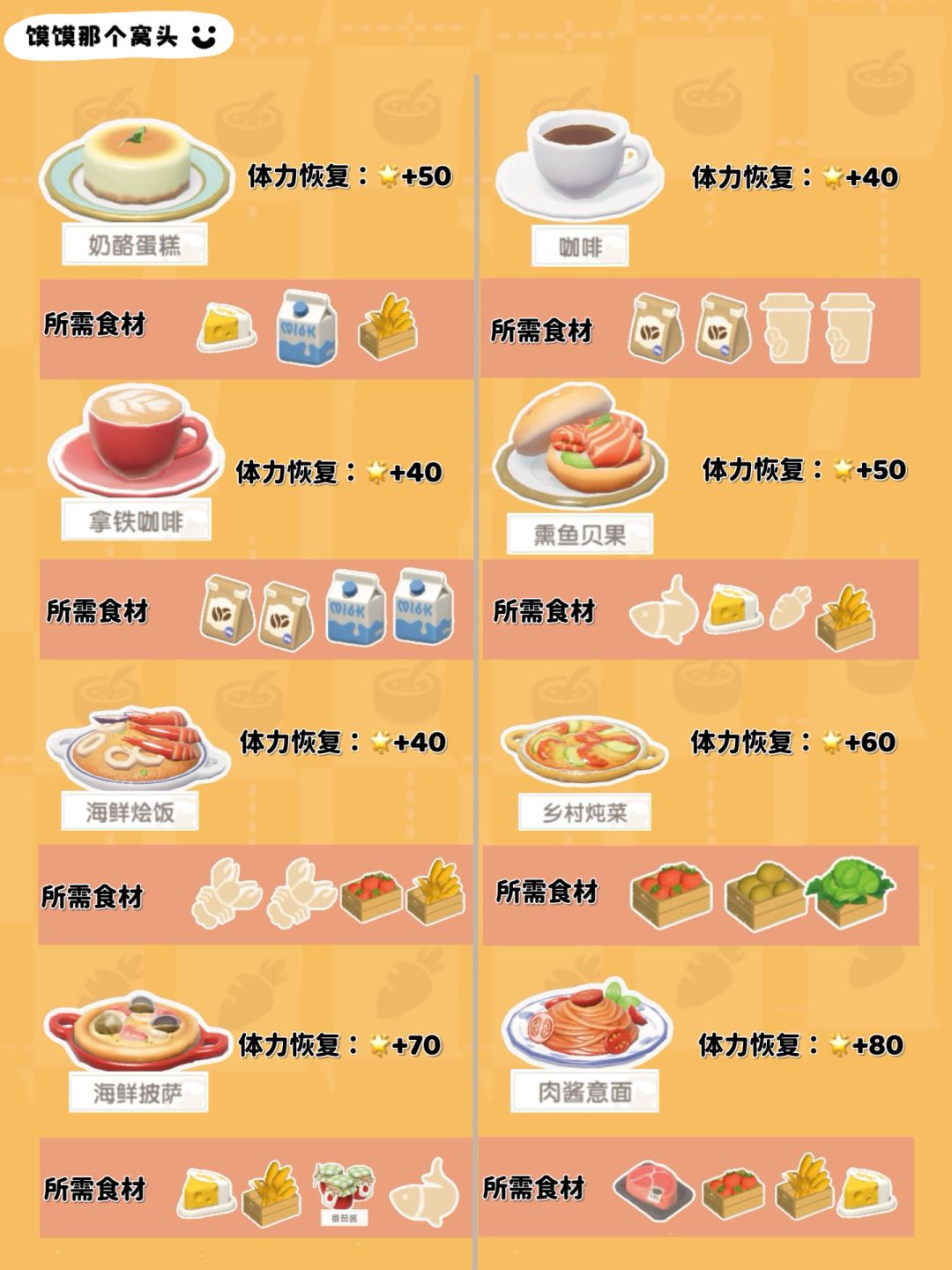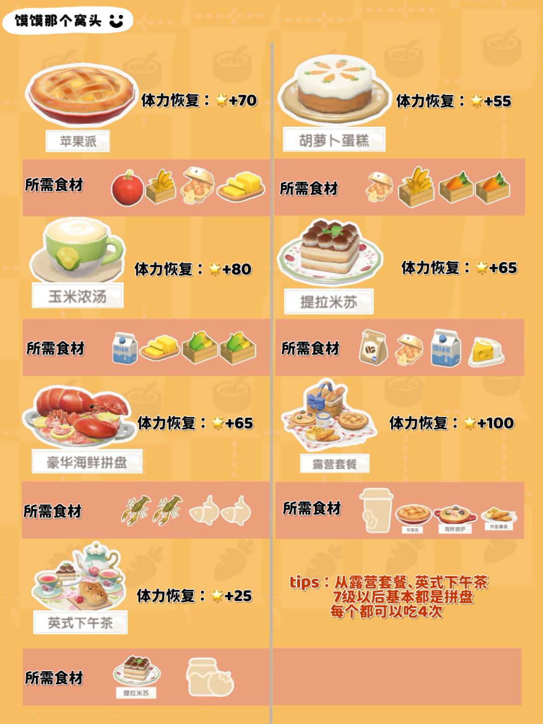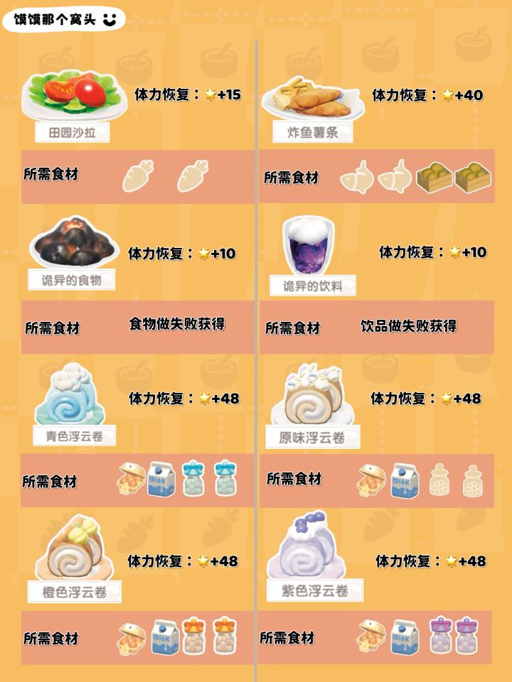5、图片只列举了食物一星品质恢复的体力数值;