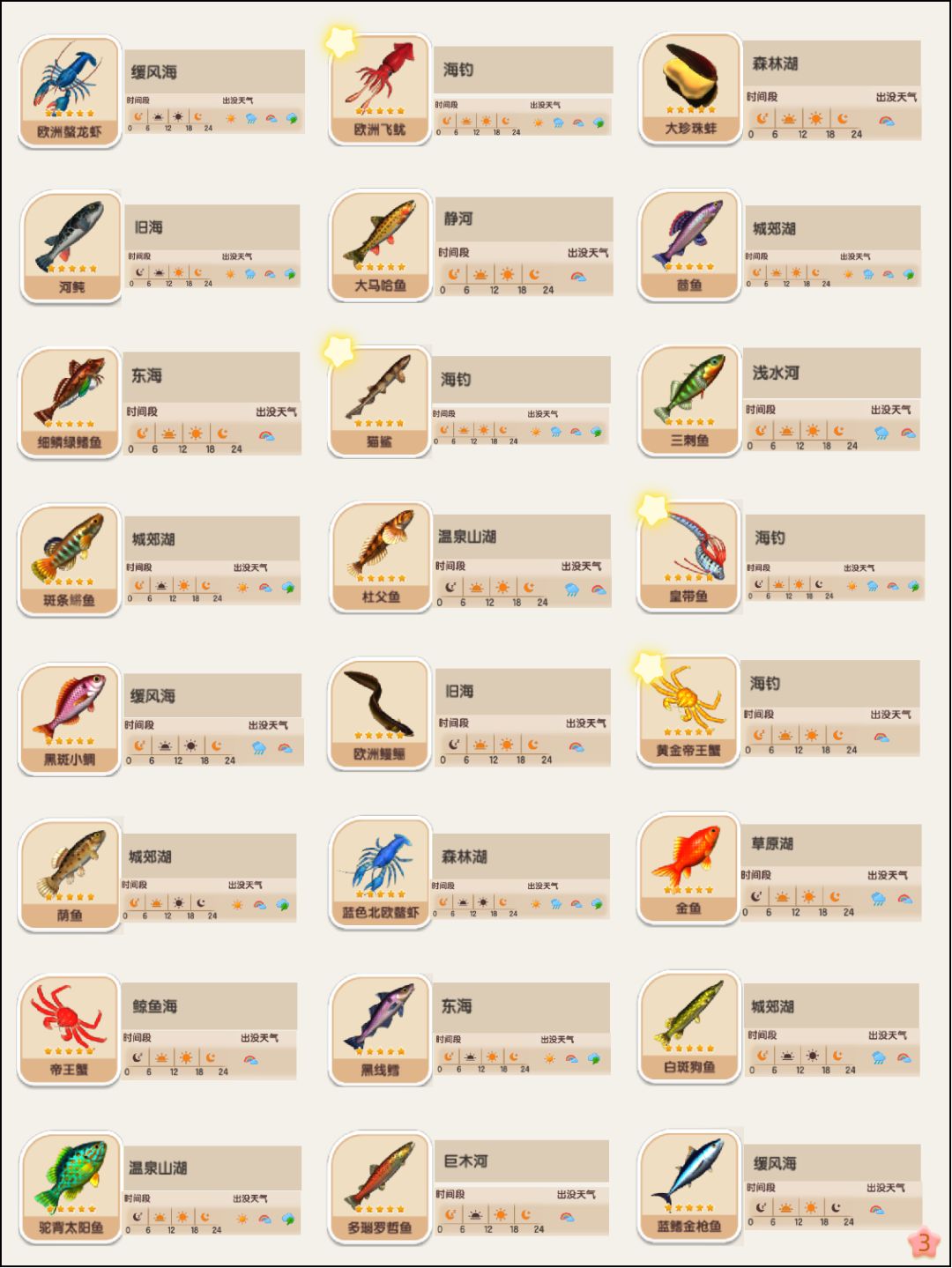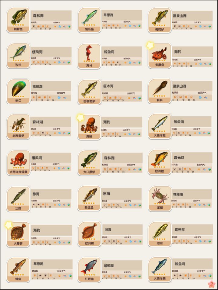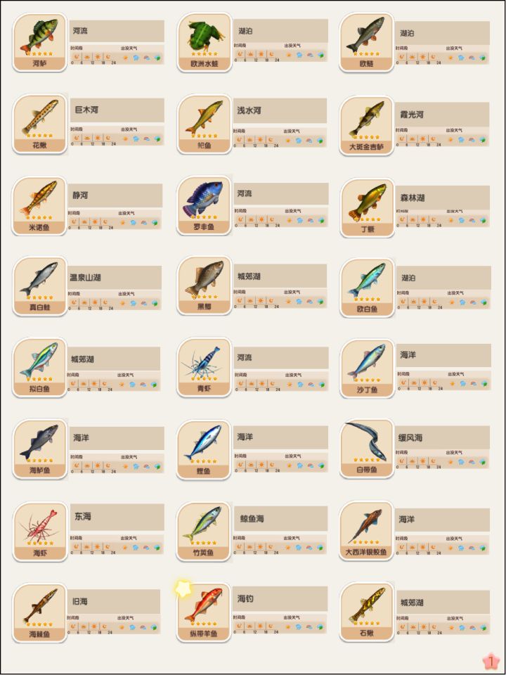 注意第二页开始,部分鱼有出现时段、天气限制啦;