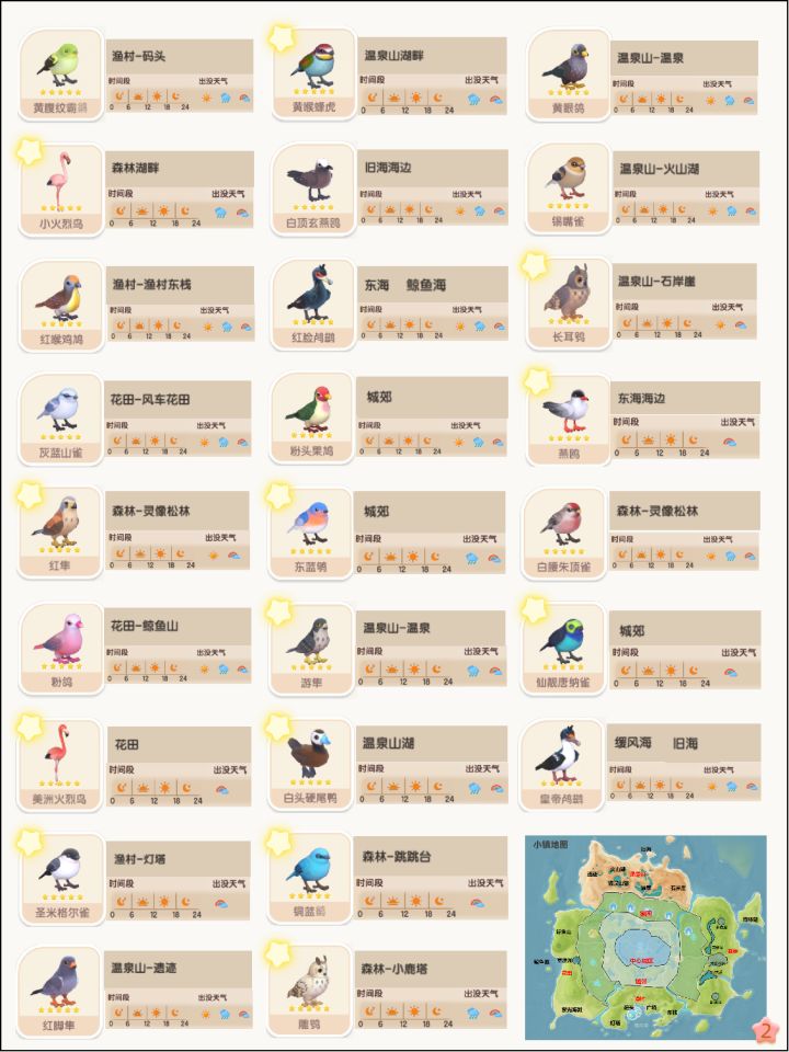 鸟基本全是全天段出现,部分鸟对应天气才会出现,左上角有小星星的,就是有天气限制的鸟,大家稍微注意下哦;