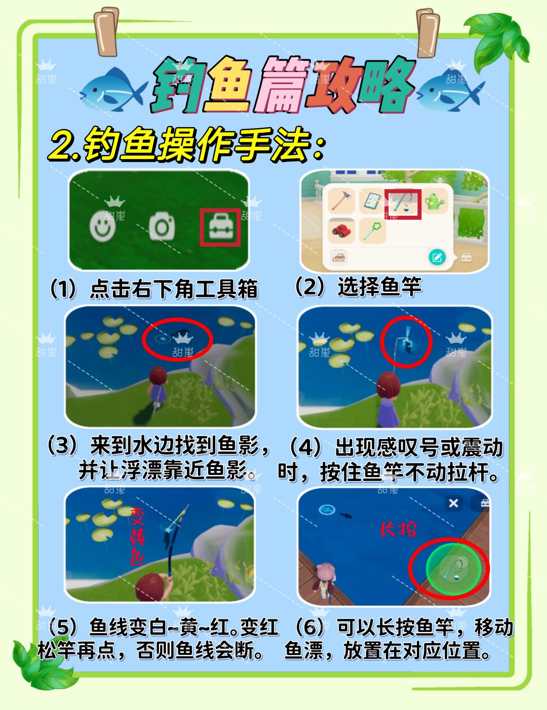(1)我们打开工具箱,选择【鱼竿】,来到水域,找到鱼影,将鱼漂靠近鱼影甩竿,等待几秒钟,湖水出现感叹号或者鱼竿抖动,长按拉竿即可!