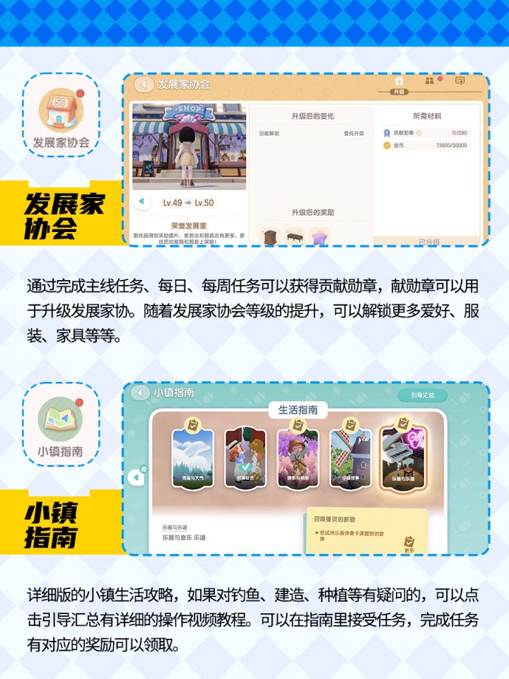 3. 【小镇指南】详细版的小镇生活攻略,如果对钓鱼、建造、种植等有疑问的,可以点击引导汇总有详细的操作视频教程。可以在指南里接受任务,完成任务有对应的奖励可以领取。