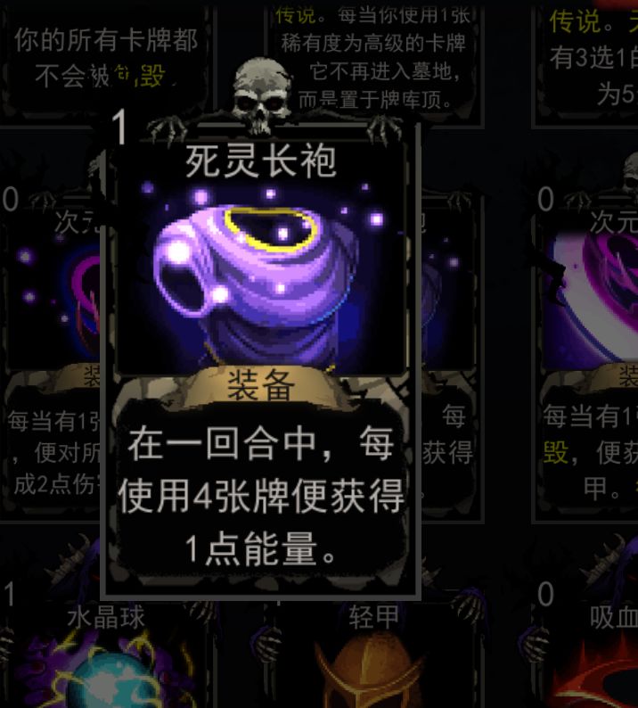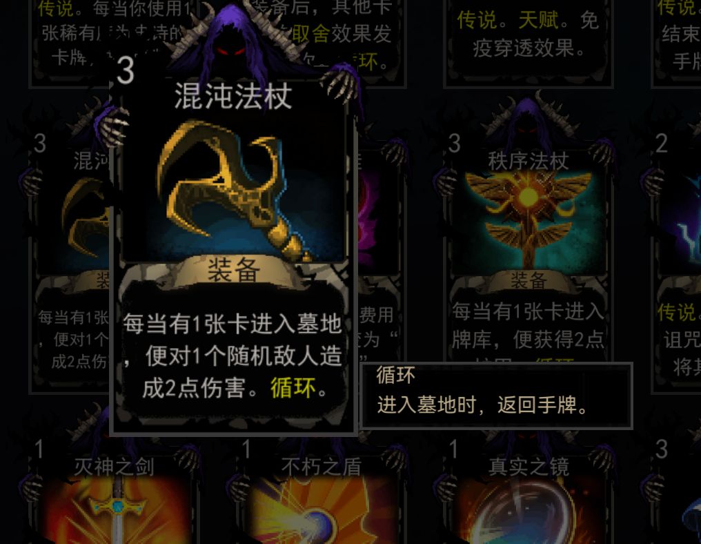 不过查找也可以带,可以检索经验丰富。经验丰富最重要的是可以刷装备,比如混沌法杖和死灵长袍。因为过牌的卡大多是无消耗的,所以可以在启动前搜牌。