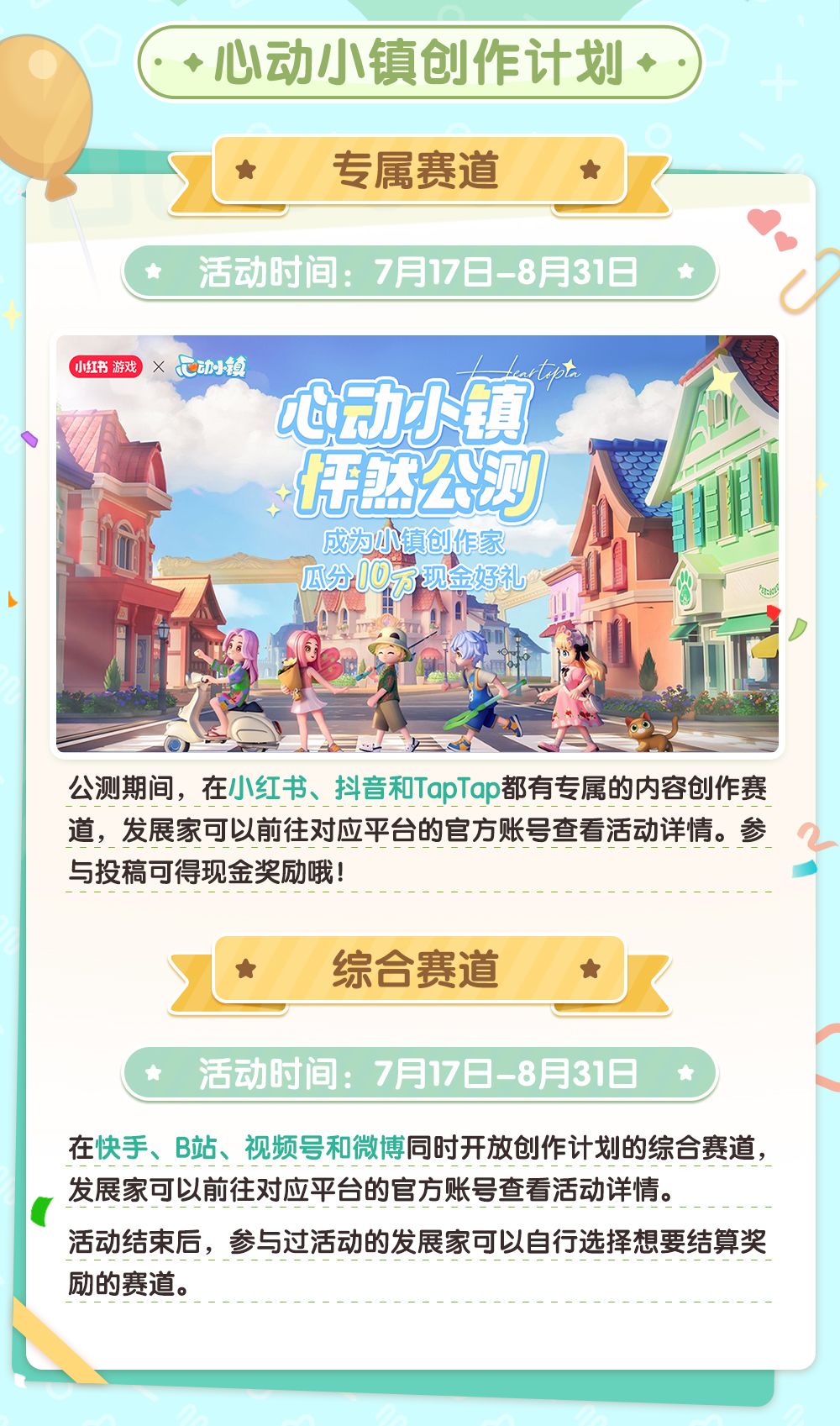 心动小镇创作计划也在进行中,在TapTap、抖音和小红书有单独的内容征集赛道,其他平台也有综合赛道哦,一起来描绘你的理想小镇吧!