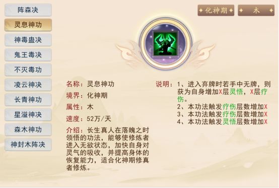 在大部分木属性的功法神通中,回复、中毒、束缚都是主要的功能效果,强化自身、削弱对手,从而完成克敌制胜。