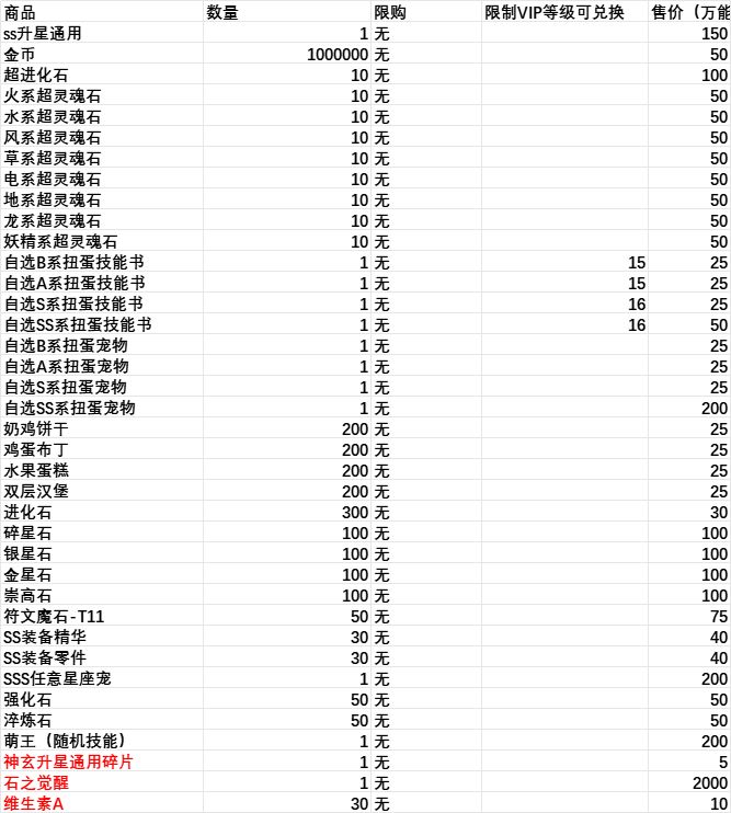万能币可兑换商品列表,不支持拆分出售,如:经验药水100个=10个币,不支持1个币兑换10个,限购商品不支持无限兑换,每周每人支持一次,同一个号/同IP都将视为同一人