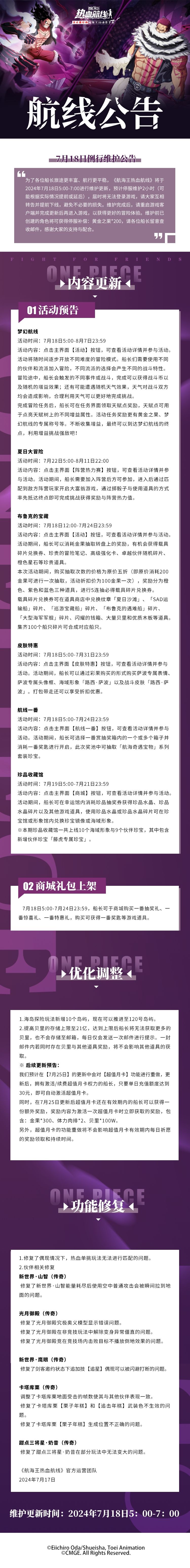 为了各位船长旅途更丰富、航行更平稳,《航海王热血航线》将于2024年7月18日5:00-7:00进行维护更新,预计停服维护2小时(可能根据实际情况提前或延后),届时将无法登录游戏,请大家互相转告并提前下线,避免不必要的损失。