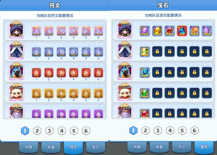 2、在该弹窗中可配置并存储英雄装配的神器、装备、符文、宝石的方案。