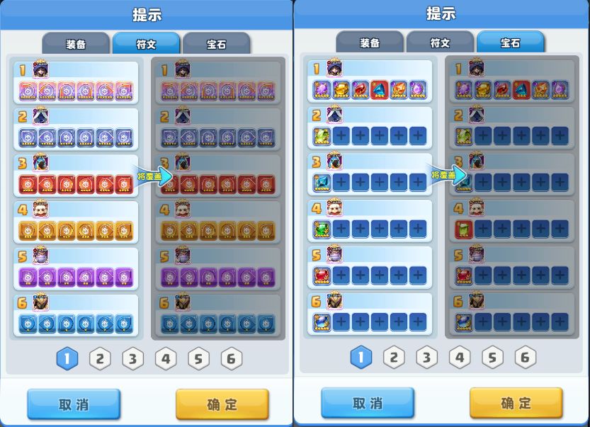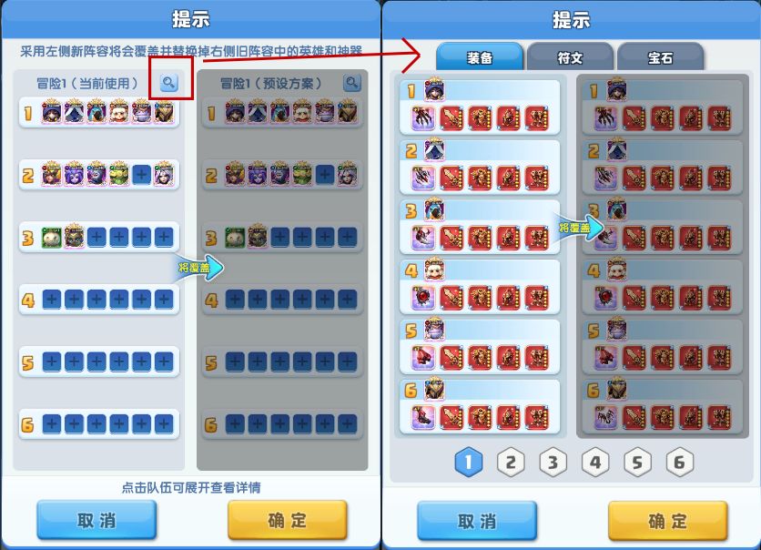 3、快捷更换功能:在功能更新后,旅行者在编辑编队方案时,可修改英雄身上穿戴的装备、符文和宝石;在修改方案后,旅行者可以通过确认弹窗查看装备、符文、宝石的前后修改对比。