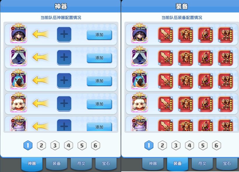 在确认装配提示弹窗中,点击【放大镜】或队伍详情就可以打开装备、神器、符文、宝石的详细对比查看界面,界面展示如下: