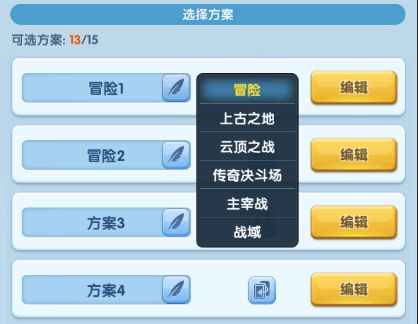 1、提供【主线冒险、上古之地、云顶之战、传奇决斗场、主宰战、战域】的方案名称供旅行者选择。